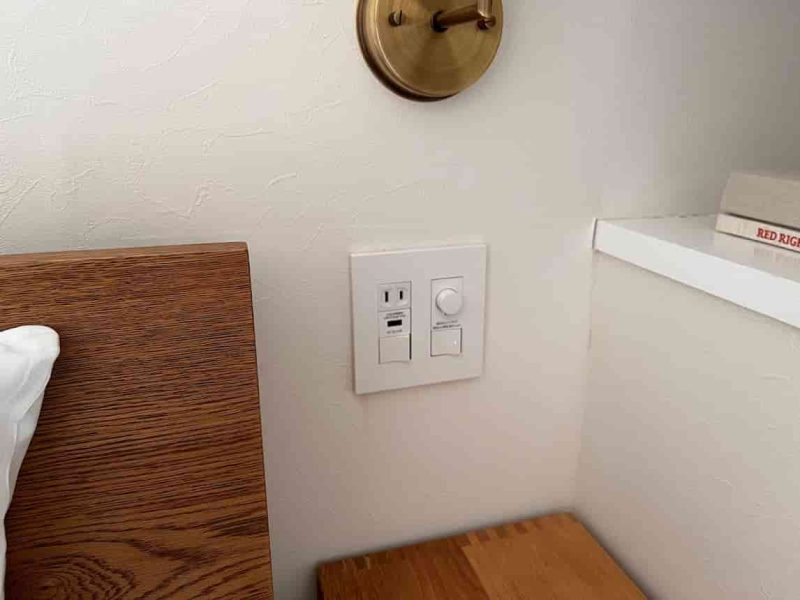 それぞれの枕元にはコンセントとUSBポートがあり、スマホの充電もバッチリです。洗面所の鏡はライト付きで、メイクをするのに重宝しました!