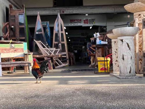 駐車場の端にある小屋と自由に歩き回るニワトリがいました!まさに東南アジアのスローな雰囲気。